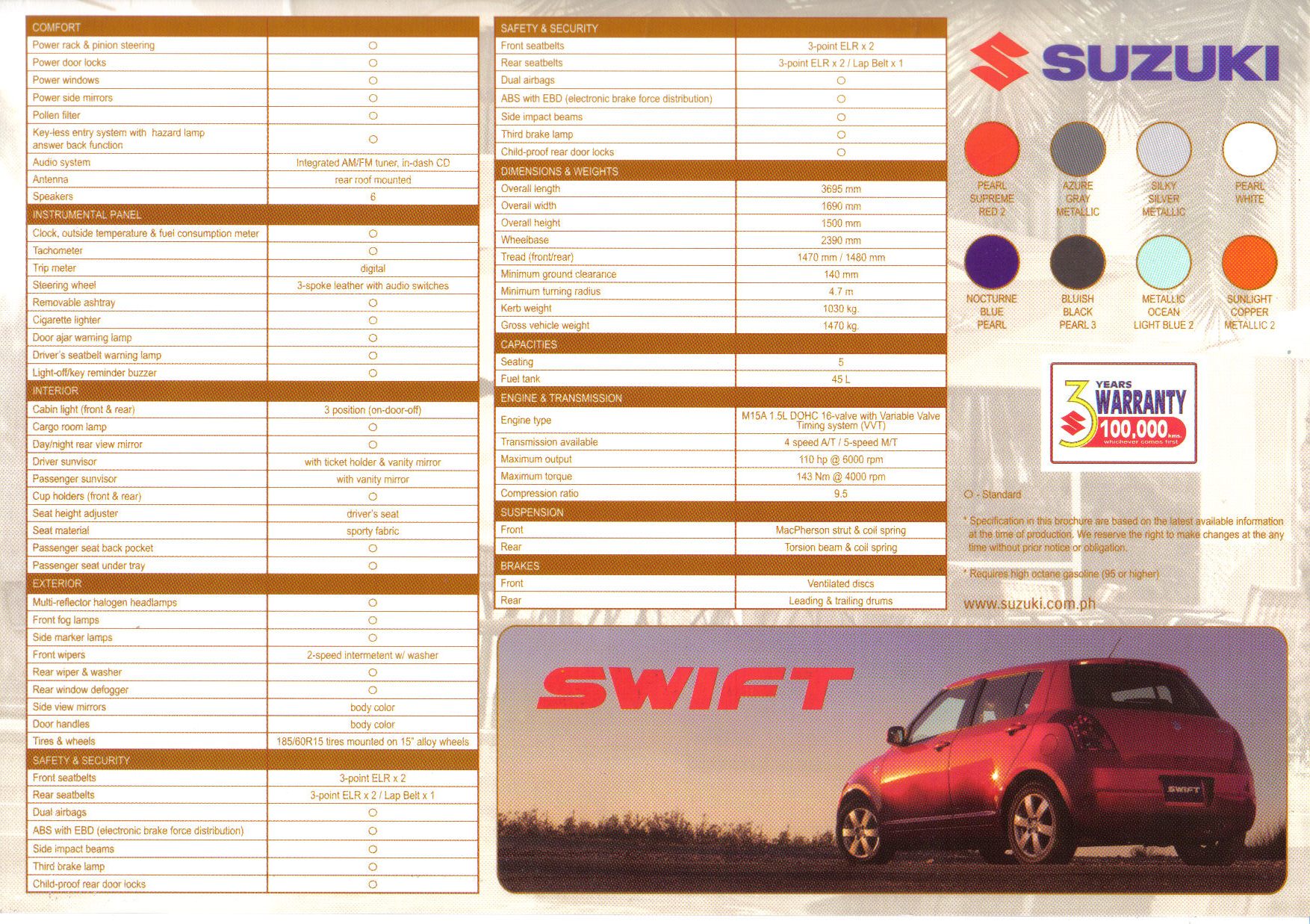 Equipped with M15A 1.4L DOHC 16-Valve with Variable Valve Timing System VVT), 4 Speed A/T, Front McPherson Strut and Coil Spring, Rear Torsion Beam and Coil Spring, Power Steering, Power windows, Central door Locks with Keyless Entry System with Hazard Lamp Answer Back function, Integrated AM-FM Tuner, With MP 3 In Dash CD, 6 Speakers, Dual Airbags, ABS Brake system with EBD (Electronic Brake Force Distribution), Side Impact Beams, Fog Lights, Fuel Tank Capacity: 42 Liters, 185/55R16 Tires.