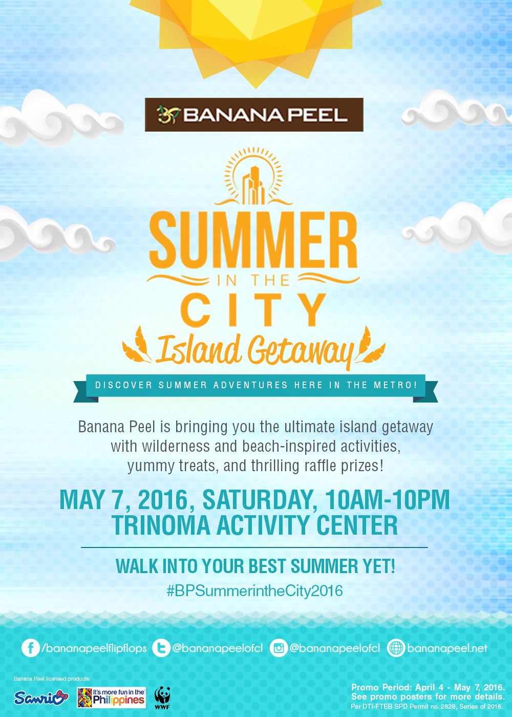 Banana Peel customers can get one event pass to the Summer in the City: Island Getaway by presenting a Php300 single-receipt purchase of Banana Peel products during the event. This pass will serve as a ticket for five to an island getaway on Saturday, May 7, 2016, at the Trinoma Activity Center.