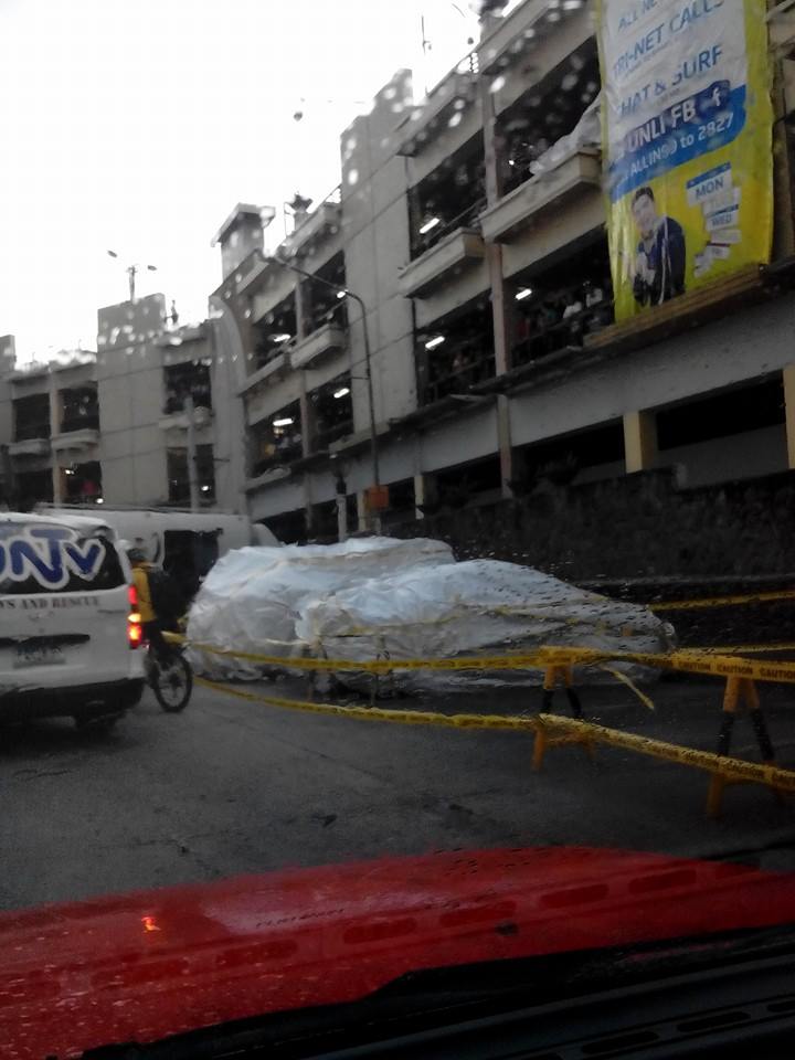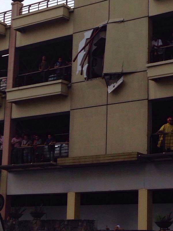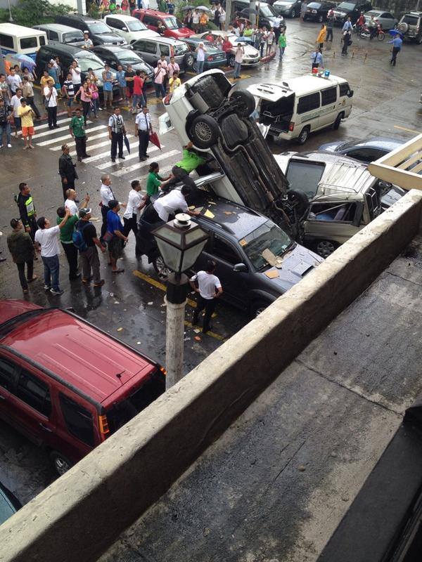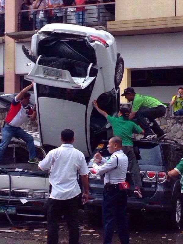 Just this afternoon of 15th August 2014, a car fell from Greenhills Car Park near O.B. Montessori. A white Mitsubishi Galant driven by a 70+ year’s old man suffered a heart attack. Before the car fell from the third floor of the Greenhill’s car park Eisenhower corner Annapolis in Greenhills it was said that the car speeded through the parking building hitting six to eight cars before crashing through the wall.
