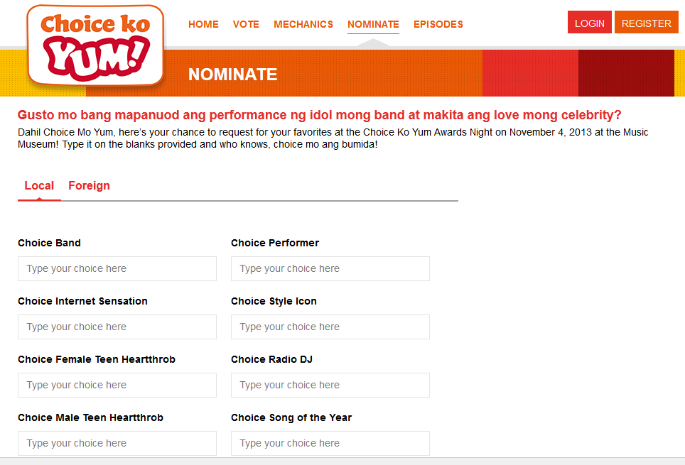 Participants must completely answer all poll questions to qualify for 1 entry. Participants may vote once a day to earn the chance to win Jollibee Gift Certificates worth P1000 each weekly or event passes to Jollibee Choice Ko Yum Awards 2013.