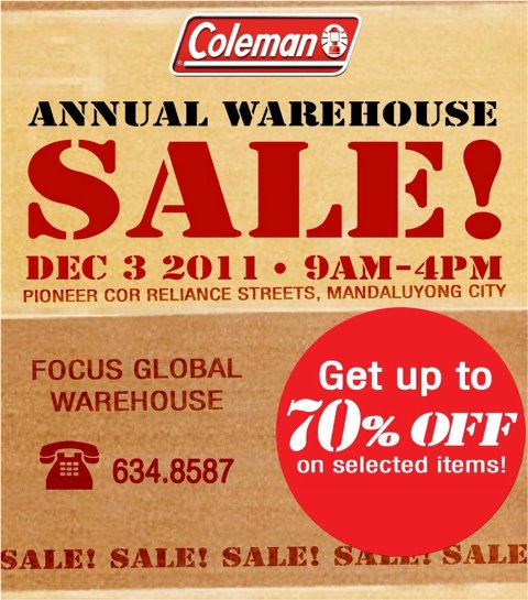 Looking for that whole range of Coleman products from jugs, coolers to all our outdoor gear (tents, sleeping bags, camp accessories, etc) this is the sale your been waiting for. The Coleman Annual Warehouse Sale this December 3, 2011 9am – 4pm at Pioneer st. corner Reliance st. at Mandaluyong City. Discounts can get up to 70% off on selected items on both brand new or class B items. Not only that they will be selling also home appliances from Oster, pillows and mattress from Tempur, and mixers from KitchenAid and DMC artworks.