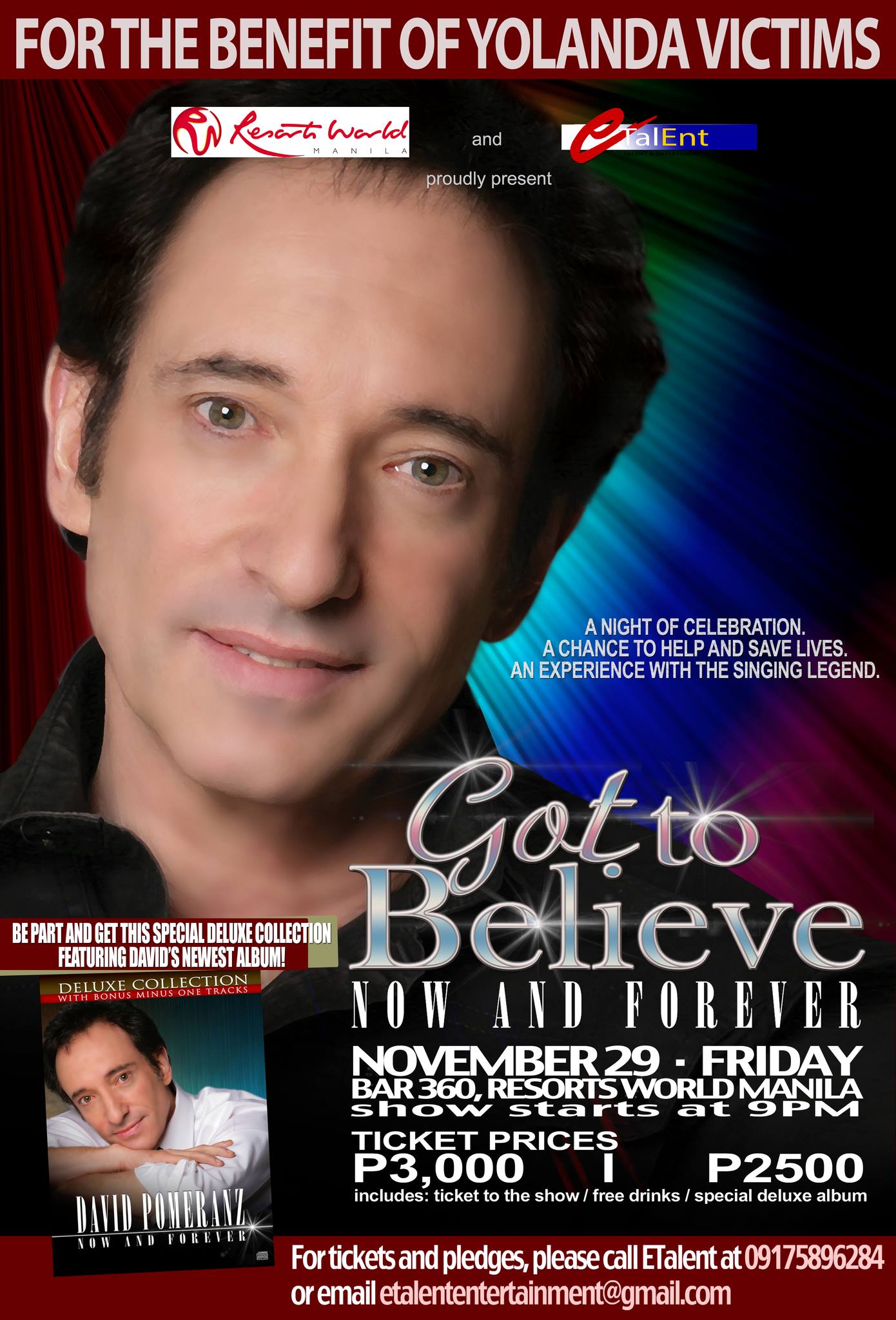 David Pomoranz’ will be having a benefit show for the victims of Typhoon Yolanda. Show will be on November 29 at Resort World Manila’s Bar 360 at 9:30PM.