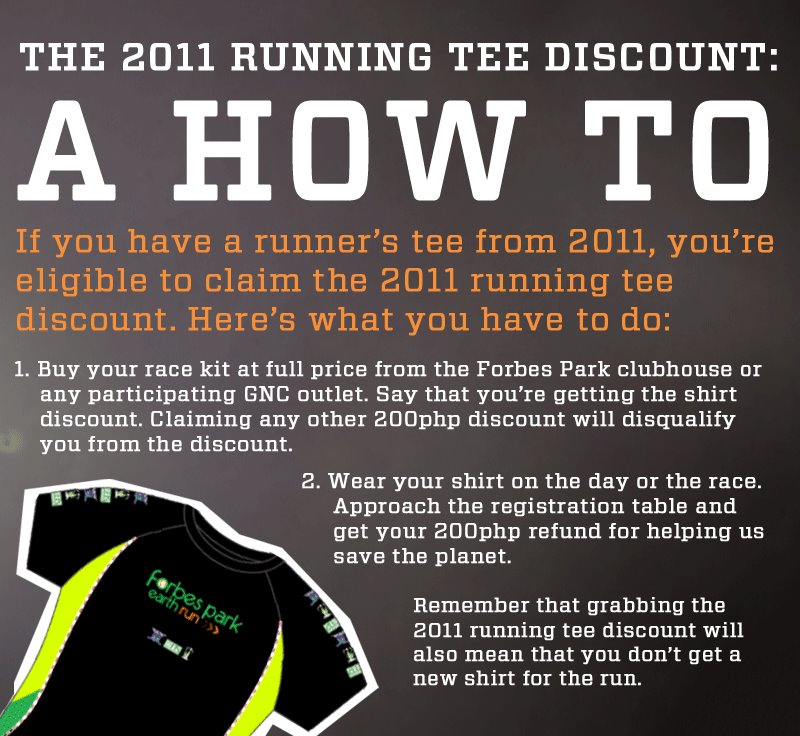 *Those that will choose to avail of the 200php discount for the shirt cannot avail of the senior or student discount. They must pay in full upon registration and wear their shirt from last year on race day, where they will get a 200php refund. Runners who avail of this cannot claim a shirt from this year.
