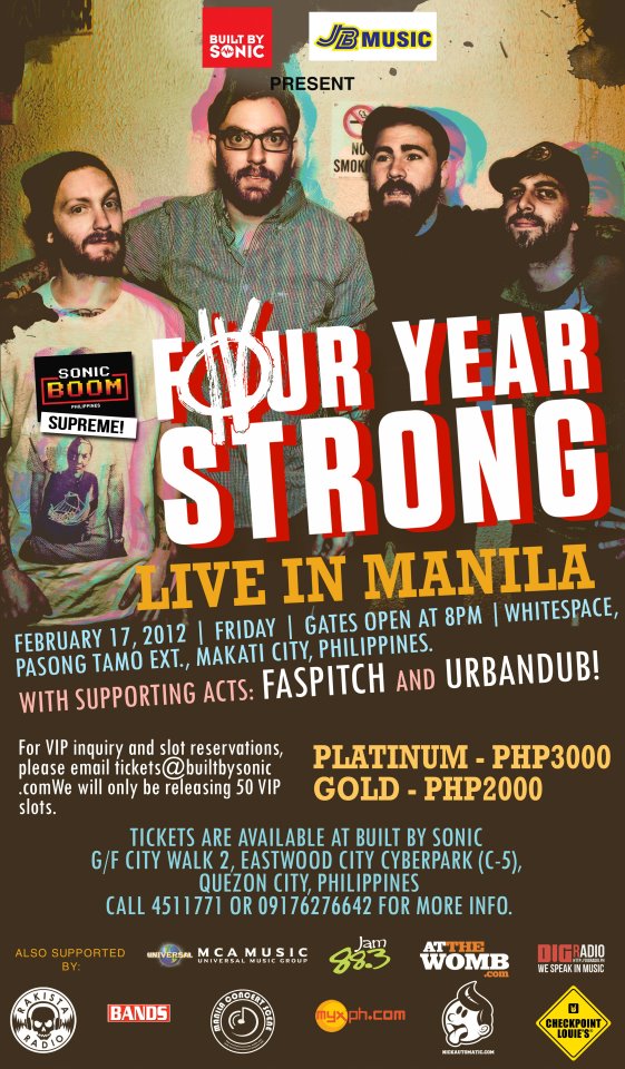 FOUR YEAR STRONG LIVE IN MANILA! HAPPENING TONIGHT! FOUR YEAR STRONG LIVE IN MANILA! HAPPENING TONIGHT! February 17, 2012 Arts and Culture Lifestyle Press Release No comments Cor