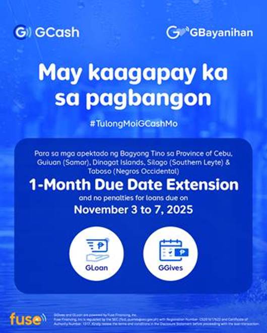 Philippines’ leading super finance app, GCash, through official lending arm Fuse Financing Inc., is extending a 30-day due date extension for GLoan and GGives borrowers impacted by Typhoon Tino.