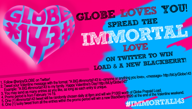 Also, in celebration of Valentine’s day and the return of Immortal Text & Call, we are giving our users the #Immortal143 Twitter contest. Prizes are P1000 worth of Globe load and a BlackBerry Curve 8520.