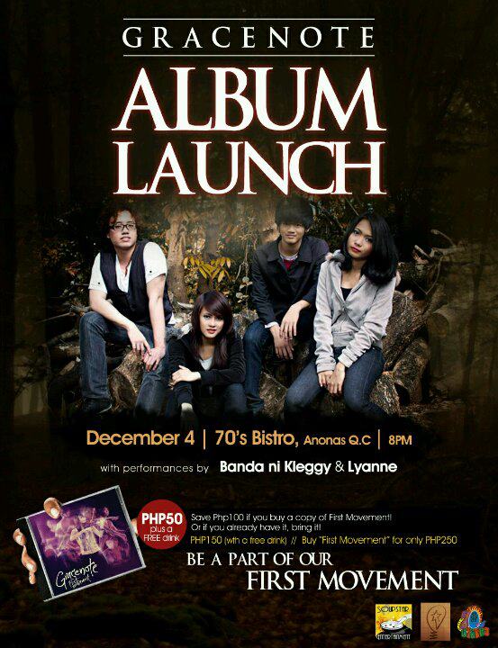 I am inviting all Gracenote fans out there to join us in the first album launching of Gracenote at 70’s bistro, Anonas this coming December 4, 2012 at 8:00pm. Gracenote also have a surprise to its fans. So bring your friends and lets support our very own Philippine talent. So you can grab a copy of Gracenote First Movement album at the venue or any record bar.