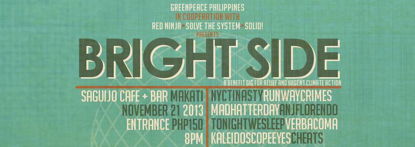 Greenpeace Philippines has teamed up with Red Ninja, Solid!, and Solve the System productions for BRIGHT SIDE: A benefit gig for relief and urgent climate action.