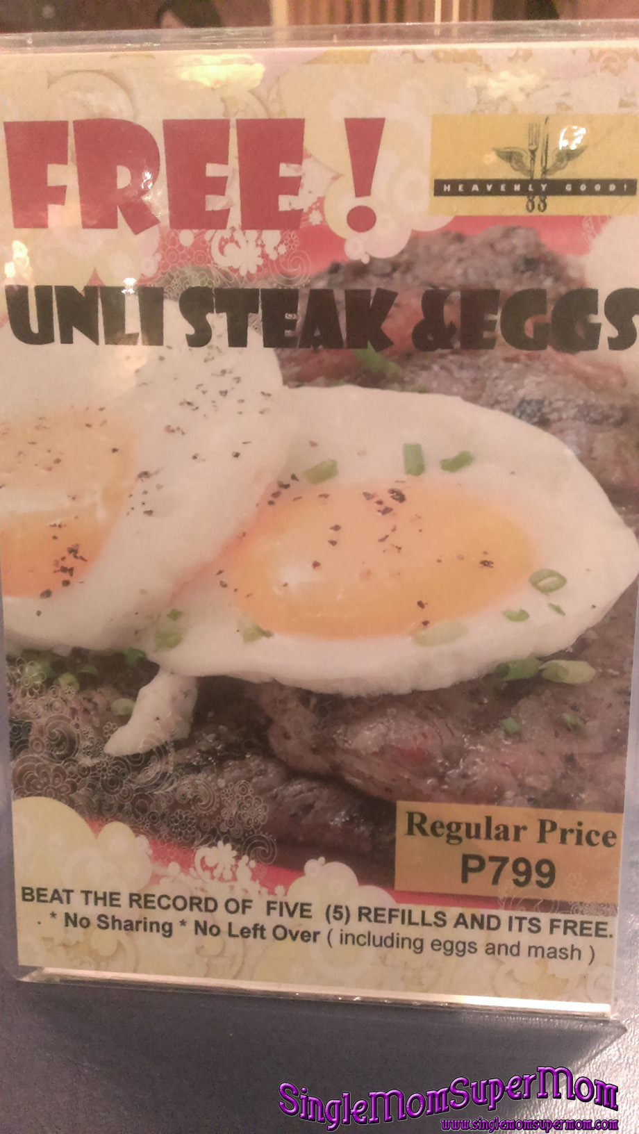 If you are not into breakfast for the time and have the appetite of a giant, you can try their well-known Eat all you can Steak and eggs. This dish has US beef steak and mashed potatoes, and country gravy. With this kind of offering my eldest son would surely enjoy dinning.
