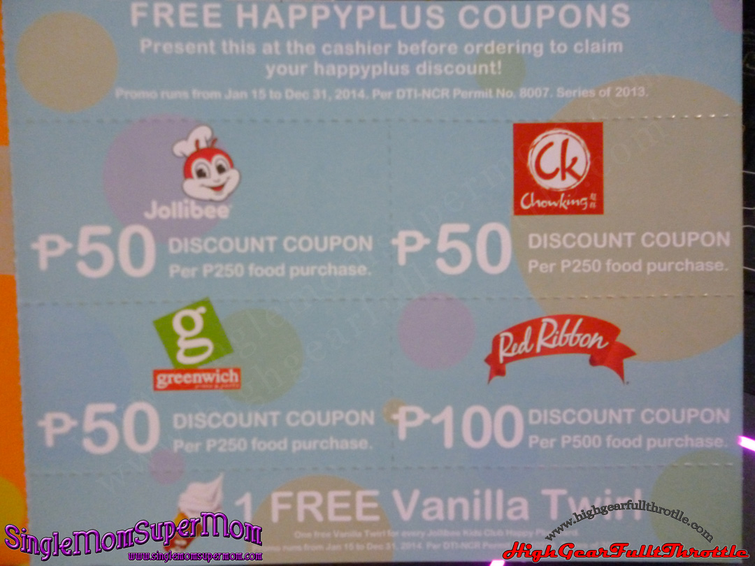• P 250 worth of discount coupons that is redeemable at Jollibee, Greenwich, Chowking and Red Ribbon