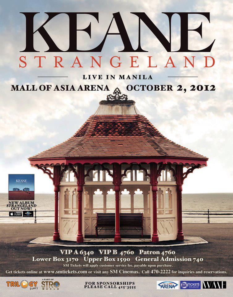 “KEANE Live! In Manila: Strangeland Tour” is brought to you by Trilogy Live and STRO World in cooperation with Dayly Entertainment. Co-Presented by Jack TV and ETC. Major Sponsors: Terranova and Banco De Oro. Official Residence: EDSA Shangri-La Manila. Media Partners: ABS-CBN, MYX, RX 93.1, Mellow 94.7, 95.5 Pinas FM, 96.3 Easy Rock, Business World, Philippine Daily Inquirer, The La Sallian, Pep.ph, ClicktheCity.com, Philstar.com, Manila Concert Scene, Philippine Concerts, MyMusicStore.com.ph, WhenInManila.com, Juice.ph and PinoyExchange.com. Special thanks to: MCA Music (Universal Music Philippines), Astroplus and Odyssey Music & Video.
