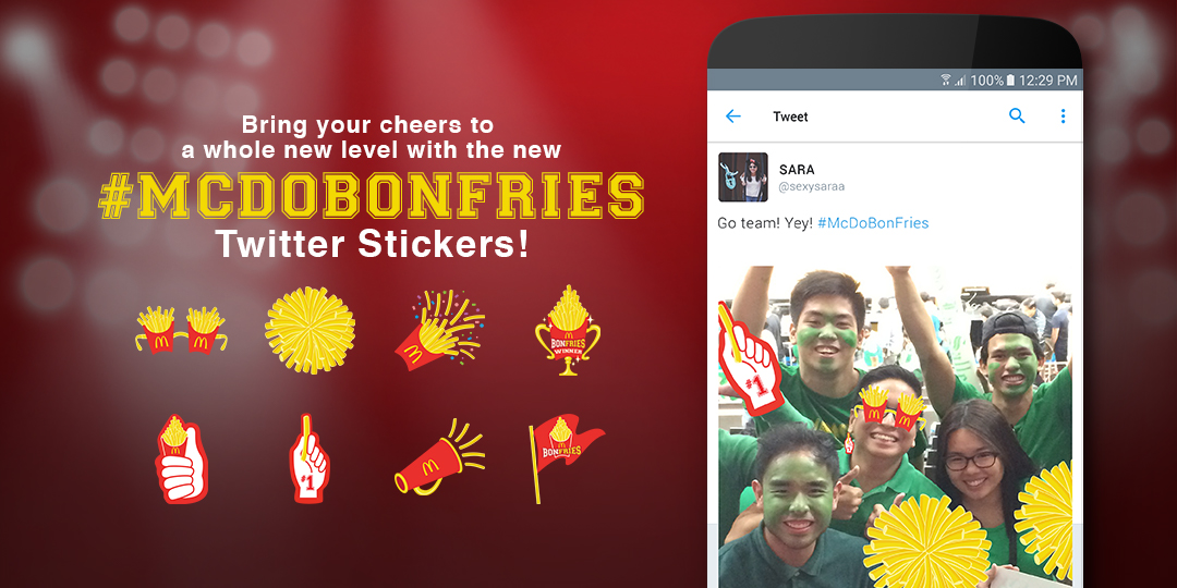 Cheer for your team in the upcoming UAAP Season 79 Cheerdance Competition this Saturday, November 19! Get creative with the eight illustrated #McDoBonFries Twitter Stickers available for free until November 27, 2016. Simply take a photo on Twitter, tap the smiley Sticker icon, pick a #McDoBonFries Sticker, put them into place, and send it in a tweet! Photos with the #McDoBonFries hashtag of your school will also automatically qualify in the BonFries Twitter contest: