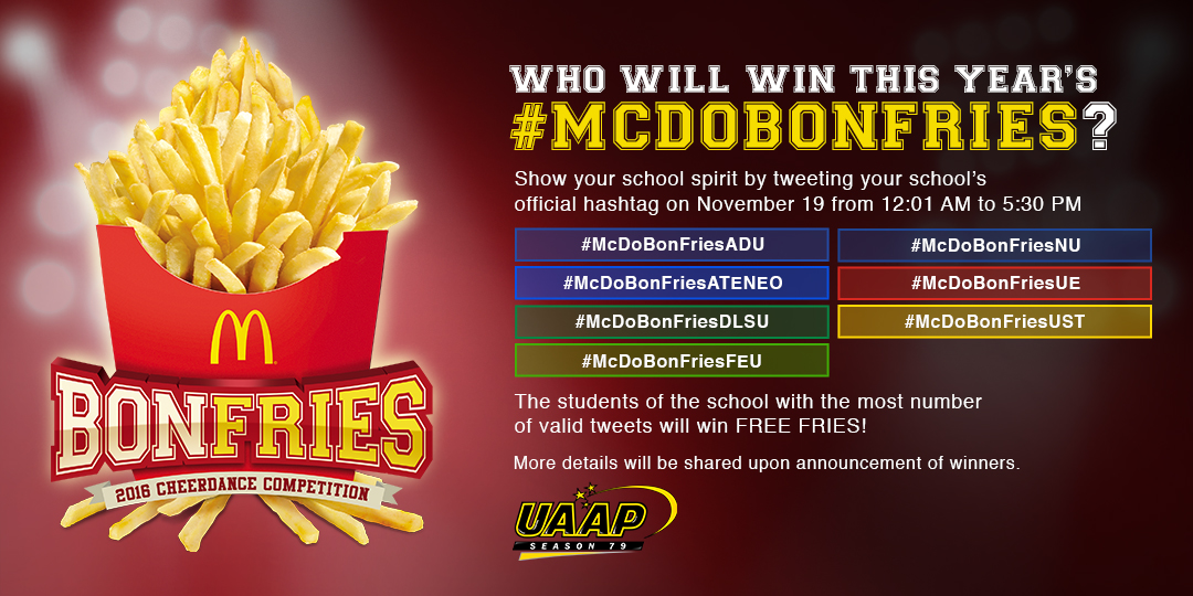The school with the most number of valid tweets on November 19, from 12:01AM-5:30PM wins the BonFries. As a treat, McDonald’s will give away medium fries to students of the winning school from 3:00PM-3:30PM in select McDonald’s stores from November 21-25.