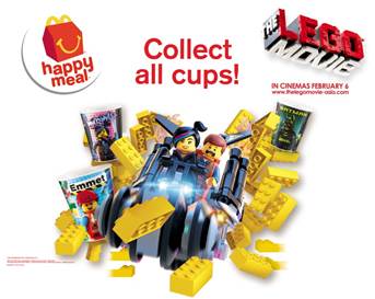 For every purchase of a Happy Meal, customers can also take home one of eight The Lego Movie 3D collectible cups. Featuring The Lego Movie characters Emmet, a perfectly average Lego minifigure, mistakenly identified as the key to saving the world; the fearless Wyldstyle, who guides Emmet on his quest; Vitruvius, an aged mystic; the mysterious Batman; and other characters, Bad Cop, Unikitty, Metal Beard and Benny, everyone is sure to enjoy building their collection.