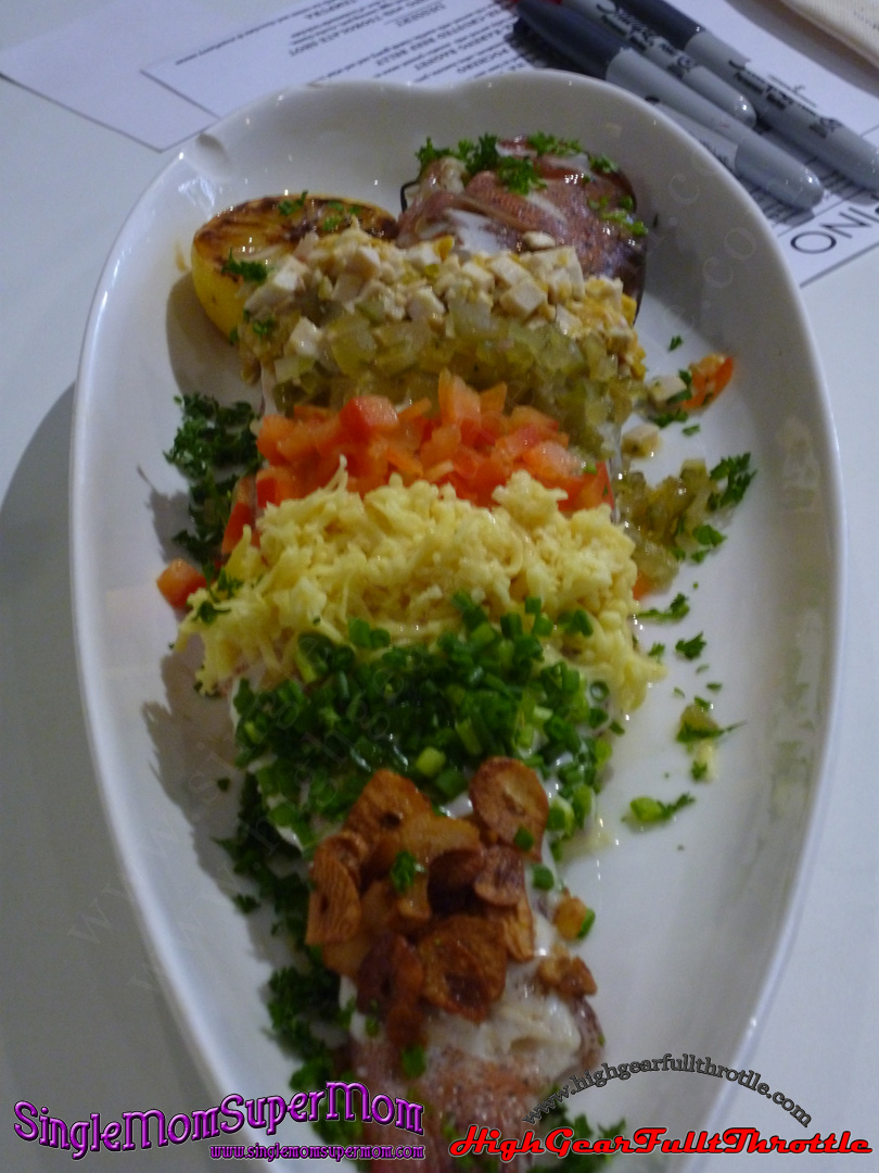 Grouper fish steamed in lemongrass and leeks. Topped with salted eggs, bell pepper, cheddar cheese, pineapple aloli, pickle relish, scallions and garlic chips.