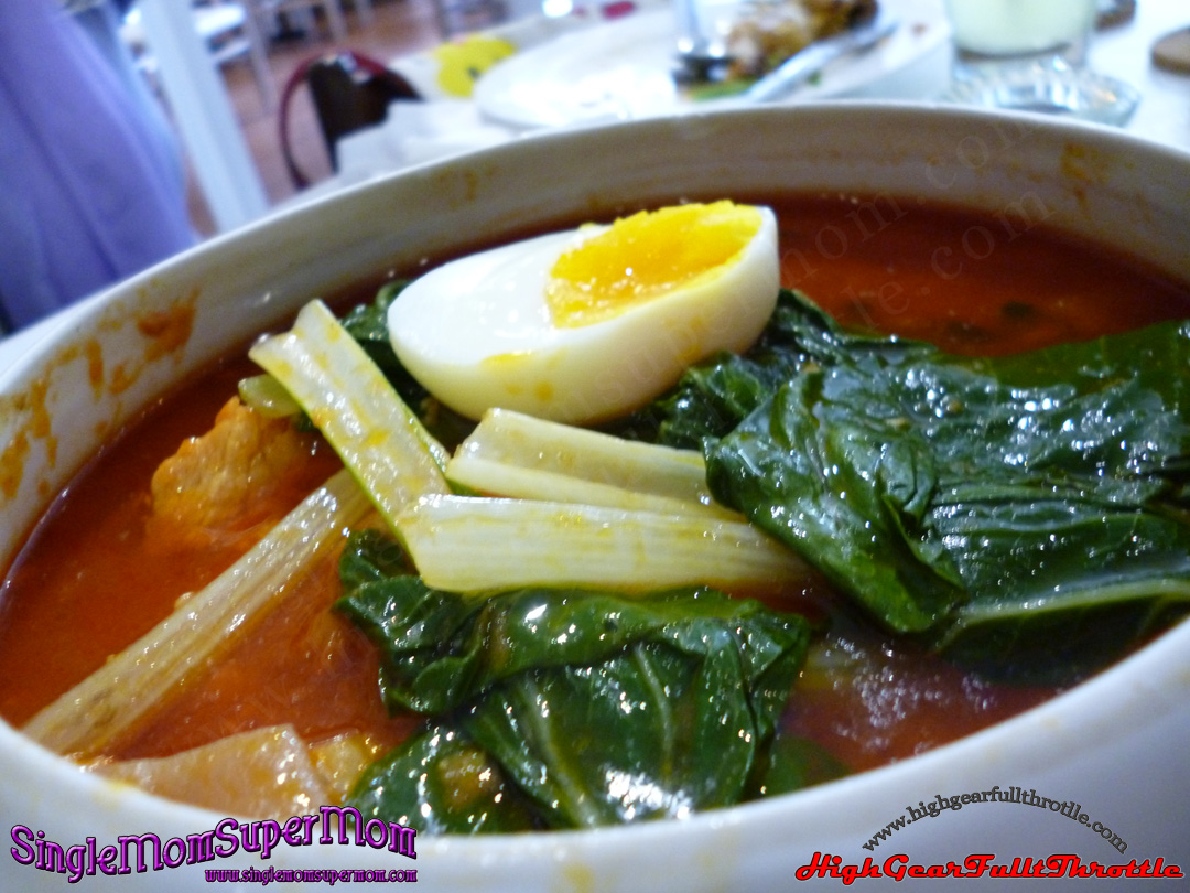 Pork stew and tender beef with crushed tomatoes, kamote, pechay, saba, and chinese chorizo.