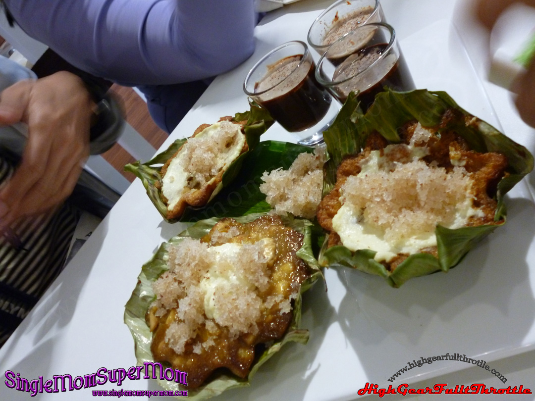Mini rice cake with topped salted eggs, ricotta cheese, kesong puti, coconut and sugar, served with a shot of homemade tsokolate.