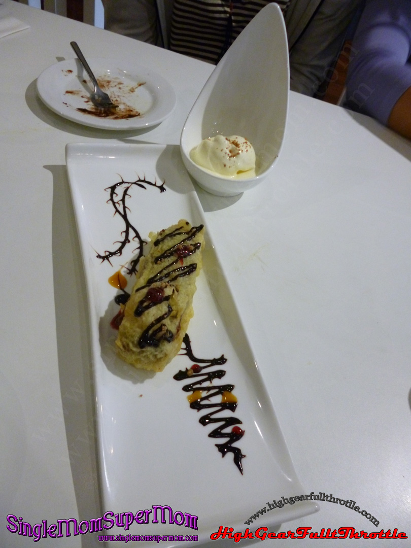 Chocolate wafer bar dipped in tempura batter that is deep fried and served with ice cream and chocolate & strawberry sauce.