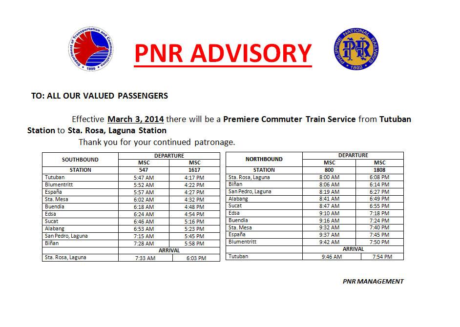 To better serve you, our valued passengers, a convenient travel and less waiting time, the once-a-day to and from Tutuban to Sta. Rosa, Laguna will be now added with four (4) more additional train trips.