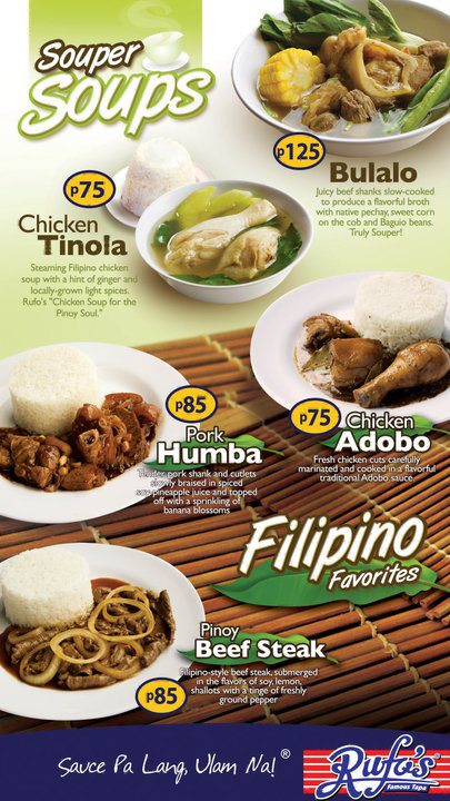 For inquiries about The Rufo’s Famous Franchise Program, contact 477-6652, 532-6335 or 533-1446 and look for Lala Alcantara or Ella Rompe. You may also visit their website at www.rufos.com.ph