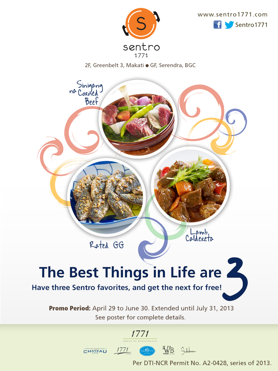 Now Sentro 1771 offers a special treat to its loyal guests – order three of the dishes mentioned above from 11:00 am to 2:30 pm and get the next one for free! Simply get a card from your server and have it stamped for each dish (max. 1 stamp per visit) then present 3 stamps within 14 days. To give more valued guests a chance to enjoy their favorites, Sentro has extended the promo period until July 31, 2013.