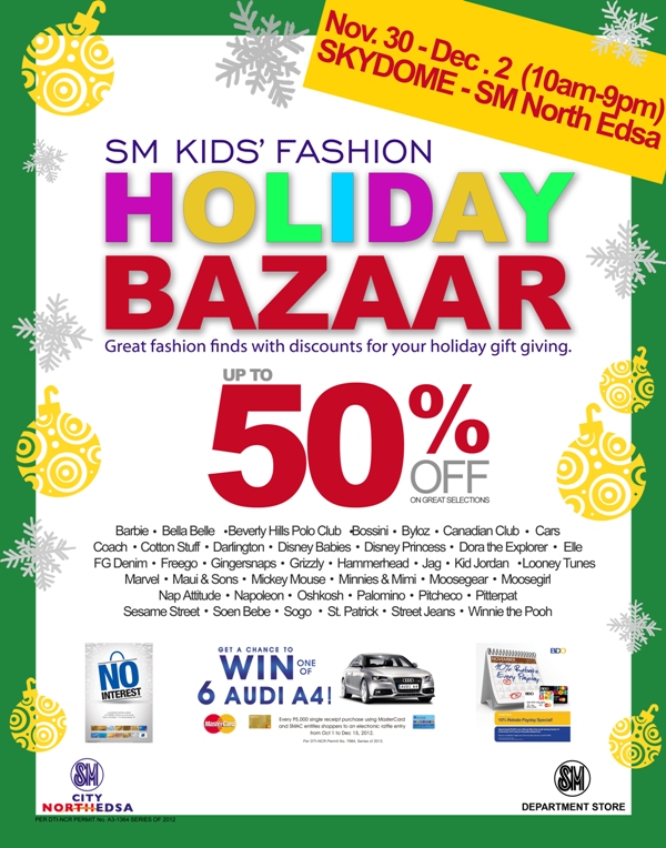 MANILA, Philippines – The festive holiday season is fast approaching and with it comes countless parties and events. In perfect timing, SM Kids’ Fashion is holding its first ever Holiday Bazaar on November 30 to December 2 and December 14 to 16, 2012. Families can enjoy up to 50% off on selected items, as well as a 0% interest for 6 months on all major credit cards for a minimum purchase of PHP5,000.00.