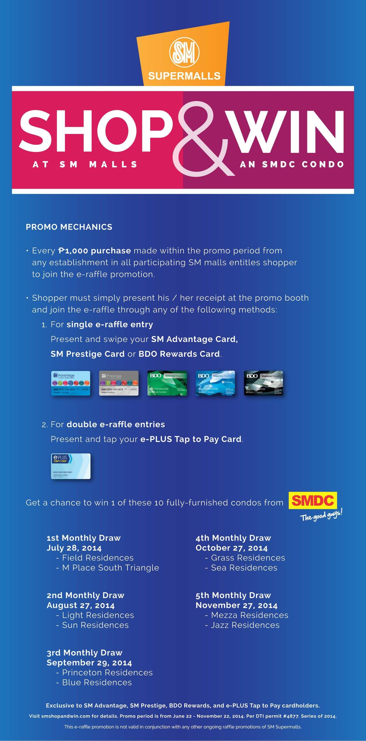The SM Supermalls Shop and Win Promo starts from June 22 up to November 22, 2014. Visit www.smshopandwin.com for more details.Like and follow SM Supermalls on facebook.com/smsupermalls and on Twitter and Instagram (@smsupermalls) for regular updates.