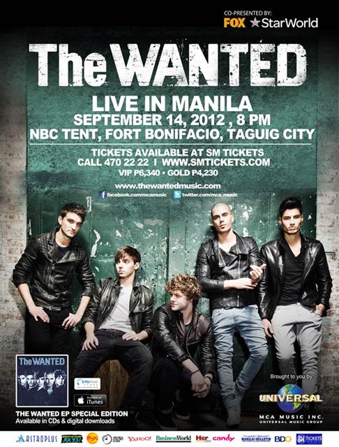 “THE WANTED Live! In Manila” is brought to you by MCA Music (Universal Music Philippines). Co-presented by Fox and StarWorld. Sponsored by: Banco De Oro and TeleTech (Come join the fun – Apply Now!). Media Partners: MYX, Monster Radio RX 93.1, Manila Bulletin, Candy Magazine, Business World, HerWord.com, Yahoo! Philippines and Manila Concert Scene. Special thanks to: Astroplus