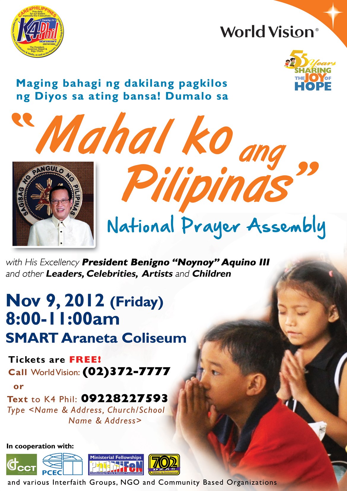 The prayer assembly culminates World Vision Philippines’ 55th Anniversary celebration, with the theme, “Sharing the Joy of Hope.” Admission is free.